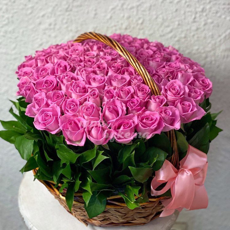 101 розовая роза в корзине