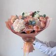 Букет персиковых кустовых роз и гортензий