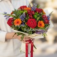Букет ярких роз и гвоздик с декором