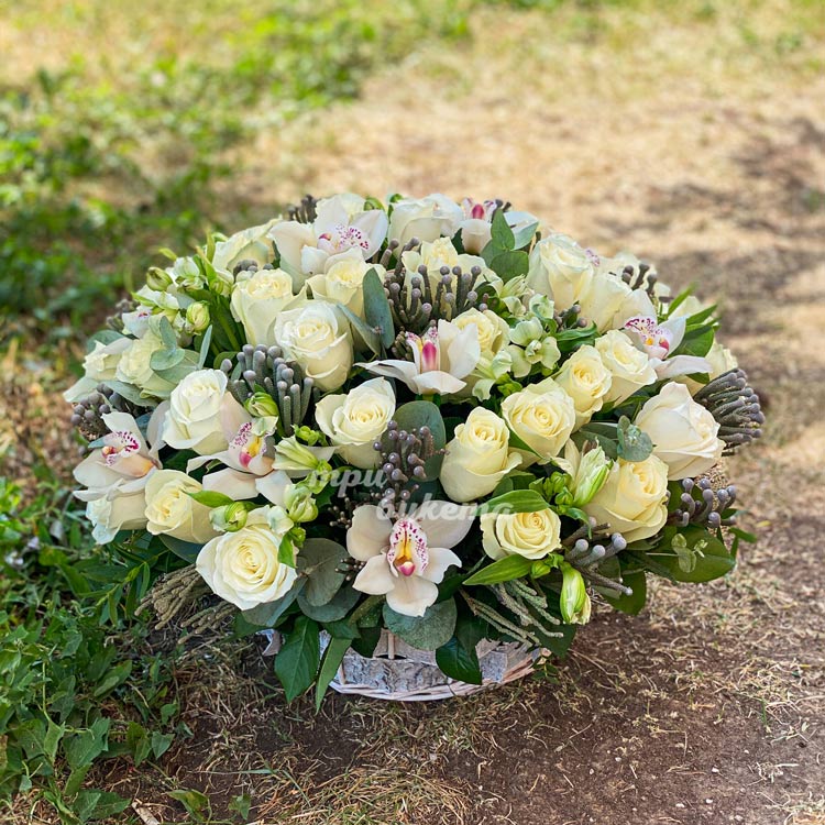 Корзина белых роз и орхидей с брунией