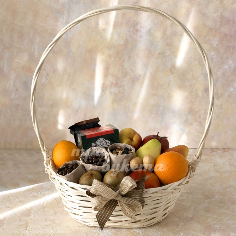 Корзина с фруктами, чаем и орешками