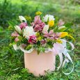 Нарциссы, фрезии и розы в коробке
