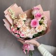 Розовый букет гвоздик и роз с гортензией