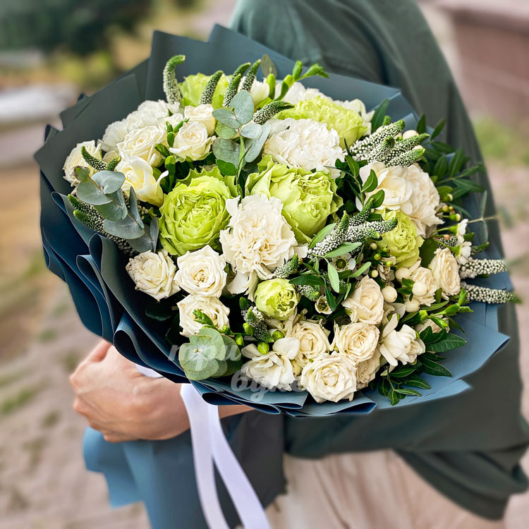 Зеленый букет из роз и гвоздик